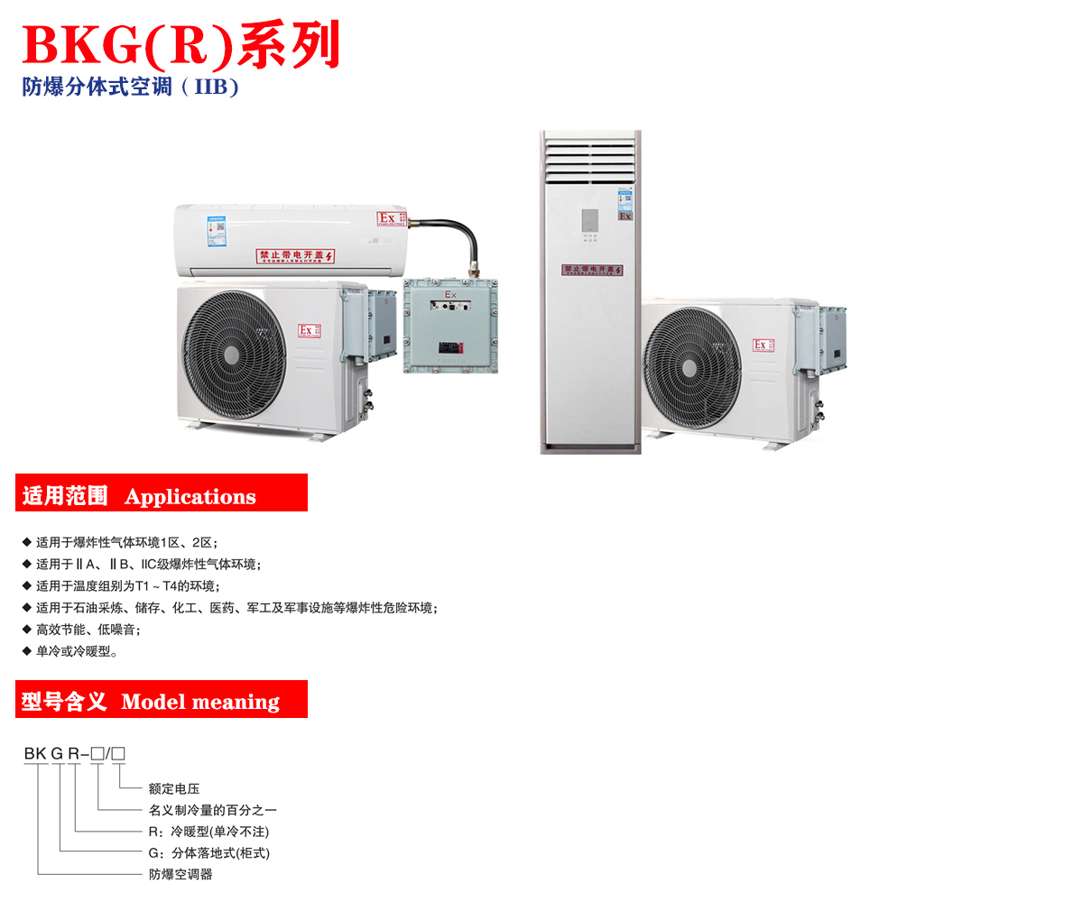 產(chǎn)品具有制冷制熱和自動除霜功能,壓縮機、風(fēng)機等都經(jīng)過特殊的防爆處理,防爆類型為整機防爆。防爆產(chǎn)品可應(yīng)用于石油、化工、醫(yī)藥、科研、軍事、危險倉庫等易燃易爆的混合性氣體環(huán)境中使用。在結(jié)構(gòu)上采用隔爆型、本安型、澆封型等復(fù)合防爆技術(shù),控制端全由本安型控制,不產(chǎn)生任何電火花,使用方便安全,采用高效多翅式換熱器,冷煤通過時與空氣的接觸更充分,能大幅度的提高空調(diào)的制冷制熱效果,手動控制和遙控兩種。